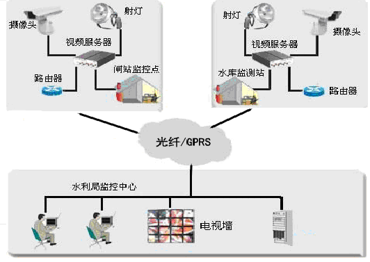 該系統(tǒng)有兩種通訊方式,當(dāng)現(xiàn)場條件允許,方便鋪設(shè)光纖或網(wǎng)線時采用有線通訊方式進行通訊;當(dāng)閘站距離監(jiān)控中心較遠,不具備鋪設(shè)通訊電纜的條件時采用GPRS無線方式進行通訊。