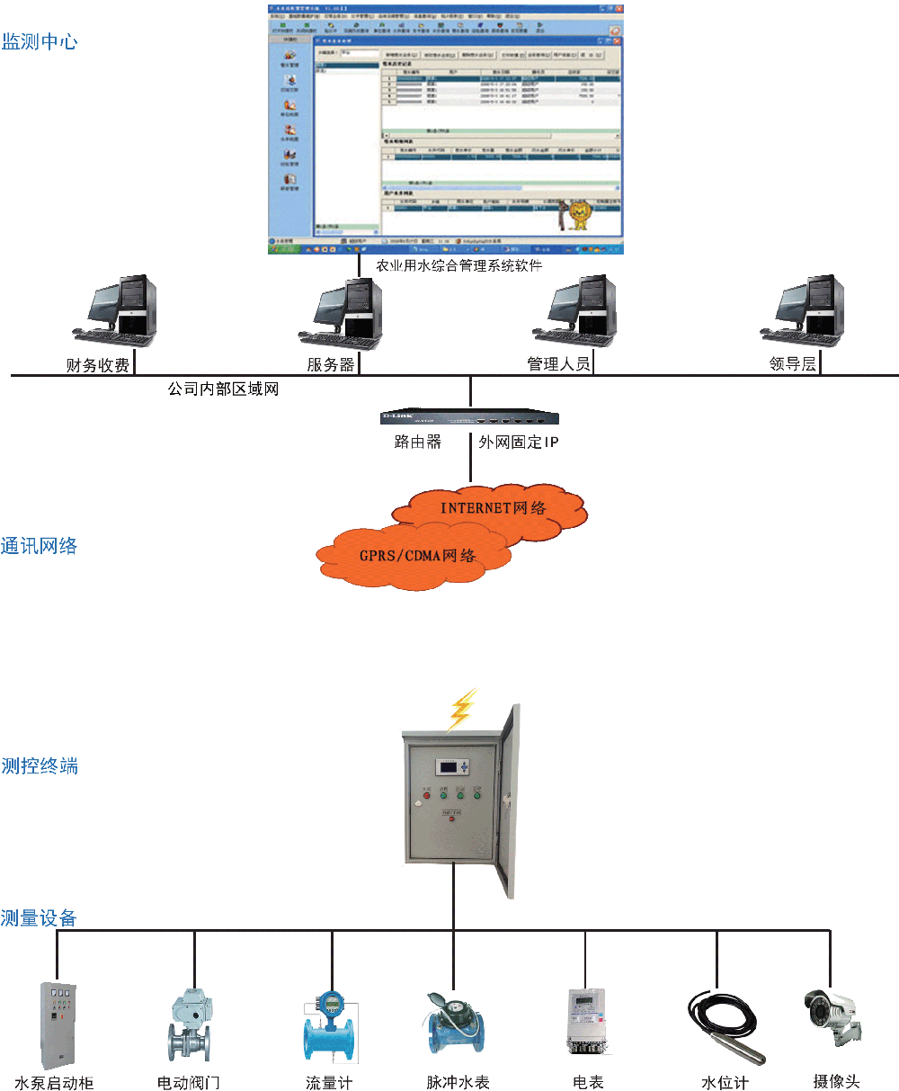 一、系統(tǒng)簡介 農(nóng)業(yè)用水綜合管理系統(tǒng)中機(jī)井灌溉IC卡收費(fèi)控制是該系統(tǒng)的核心,它將機(jī)井灌溉控制器、交流接觸器以及配電設(shè)備安裝在一個(gè)機(jī)箱內(nèi),可以采集灌溉用電量、用水量或灌溉時(shí)間并自動(dòng)收取灌溉費(fèi)用。農(nóng)田機(jī)井灌溉收費(fèi)控制箱不僅使管理部門實(shí)現(xiàn)了先收費(fèi)、后灌溉的管理目標(biāo);也使農(nóng)戶達(dá)到了借助IC卡自主澆地的目的。同時(shí)也成功解決了農(nóng)業(yè)機(jī)井灌溉管理中長期存在的電費(fèi)/水費(fèi)計(jì)量不準(zhǔn)、拖欠灌溉費(fèi)用和浪費(fèi)水資源的難題。 二、系統(tǒng)組成 v 監(jiān)控中心:中心服務(wù)器、外網(wǎng)固定IP、水資源管理系統(tǒng)軟件、收費(fèi)管理系統(tǒng)軟件; v 通信網(wǎng)絡(luò): 基于移動(dòng)無線GPRS或電信無線CDMA網(wǎng)絡(luò); v 采集控制終端:IC卡控制終端、GPRS/CDMA DTU; v 計(jì)量儀表:流量計(jì)/水表/電表、水泵控制柜/電動(dòng)閥門。