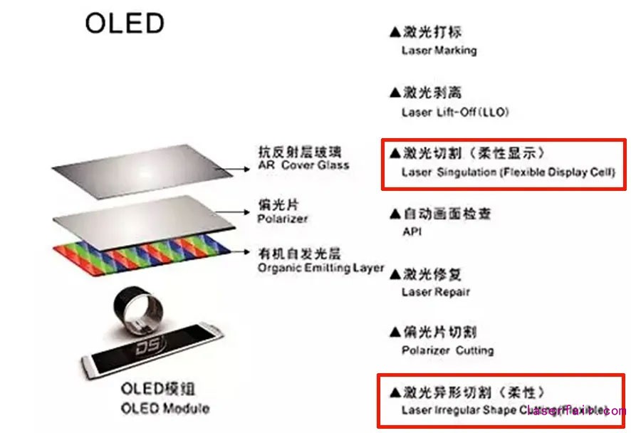 可折疊手機(jī)的屏幕采用的是柔性O(shè)LED屏,所謂的柔性屏就是指:可以自由彎曲、折疊的屏幕。柔性屏作為嶄新的領(lǐng)域,在加工過(guò)程中面臨著許多問(wèn)題,對(duì)加工工藝提出了更高的要求。與傳統(tǒng)的脆性材料加工相比,OLED顯示屏由于其復(fù)雜的分層機(jī)構(gòu),在制造過(guò)程中必須以最高的精密度進(jìn)行加工,以保證質(zhì)量和良品率。